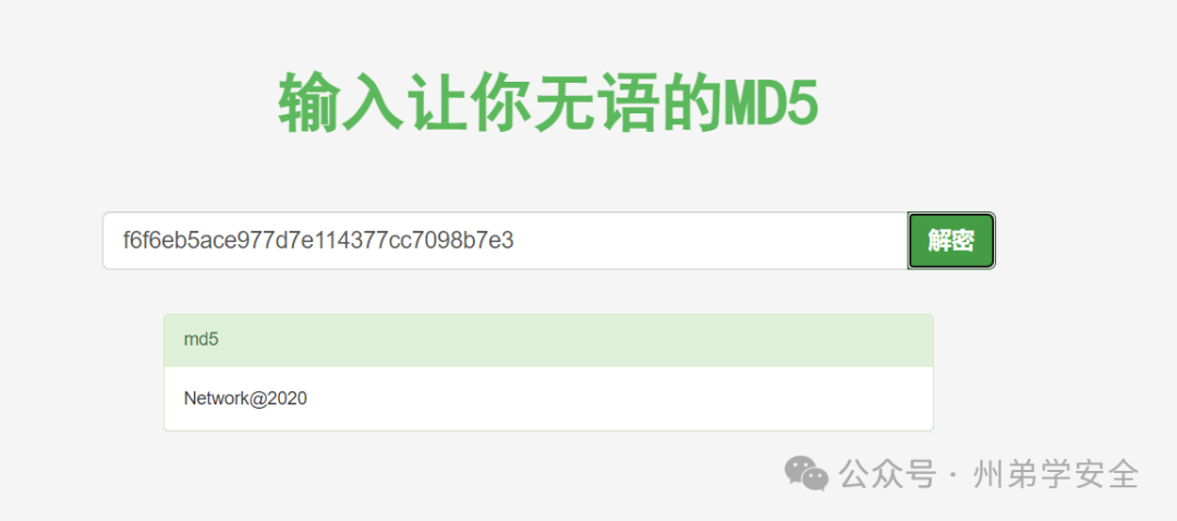 将查询到的admin(管理员)的密码进行MD5解密后,看到被修改的密码为Network@2020