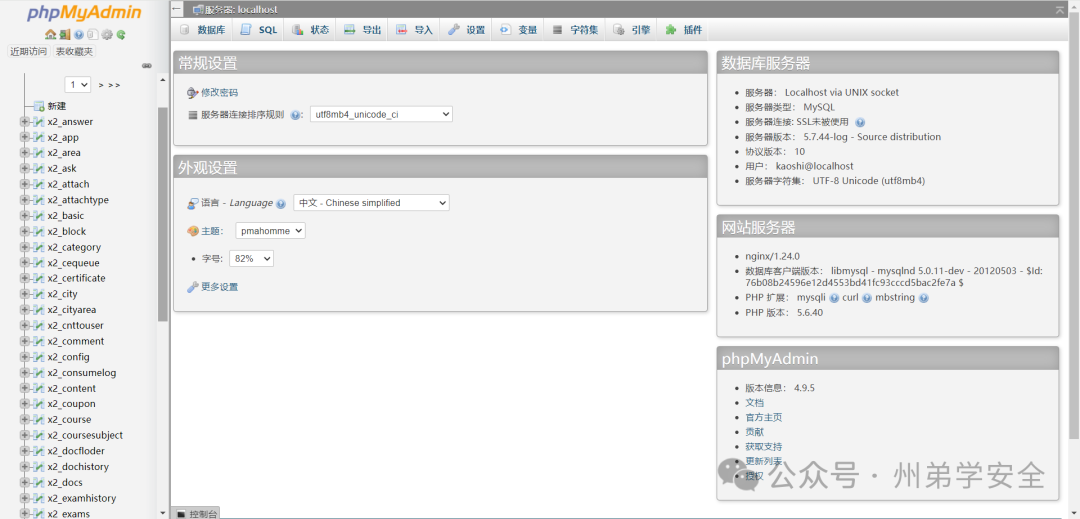 在宝塔面板中点击 数据库-phpmyadmin访问,接着登录后查看库名”kaoshi”