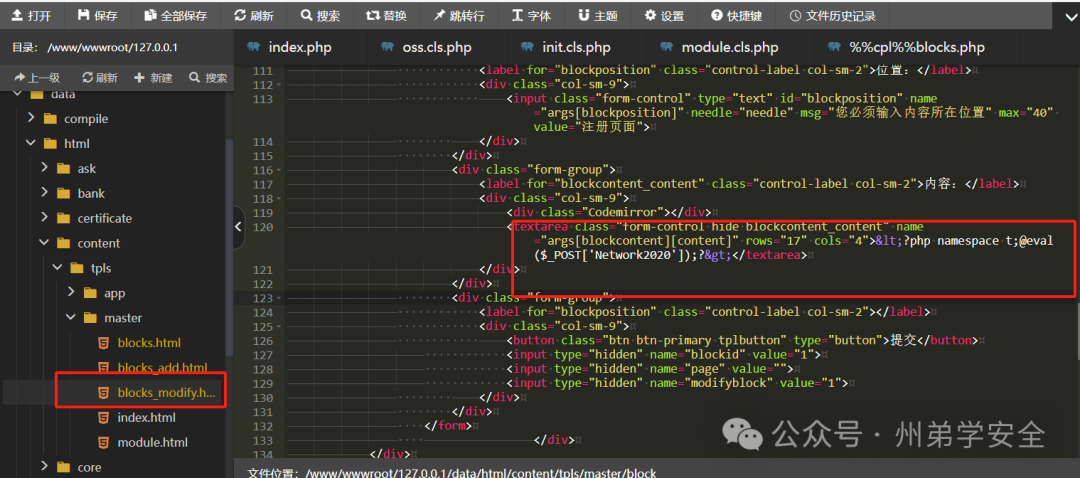 会进行序列化存储到数据库,在获取模板模式的数据的过程中,blockcontent会被反序列化并将内容赋值给 app/content/cls/api.cls.php中的$tp 最后在进入eval执行了代码