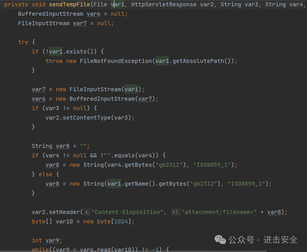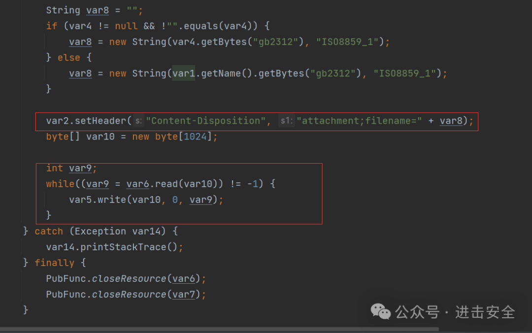这里对我们传入的参数为var1先进行调用了FileInputStream后又传递给了字节缓冲流,并且在最后进行了文件的读取,并且下载。