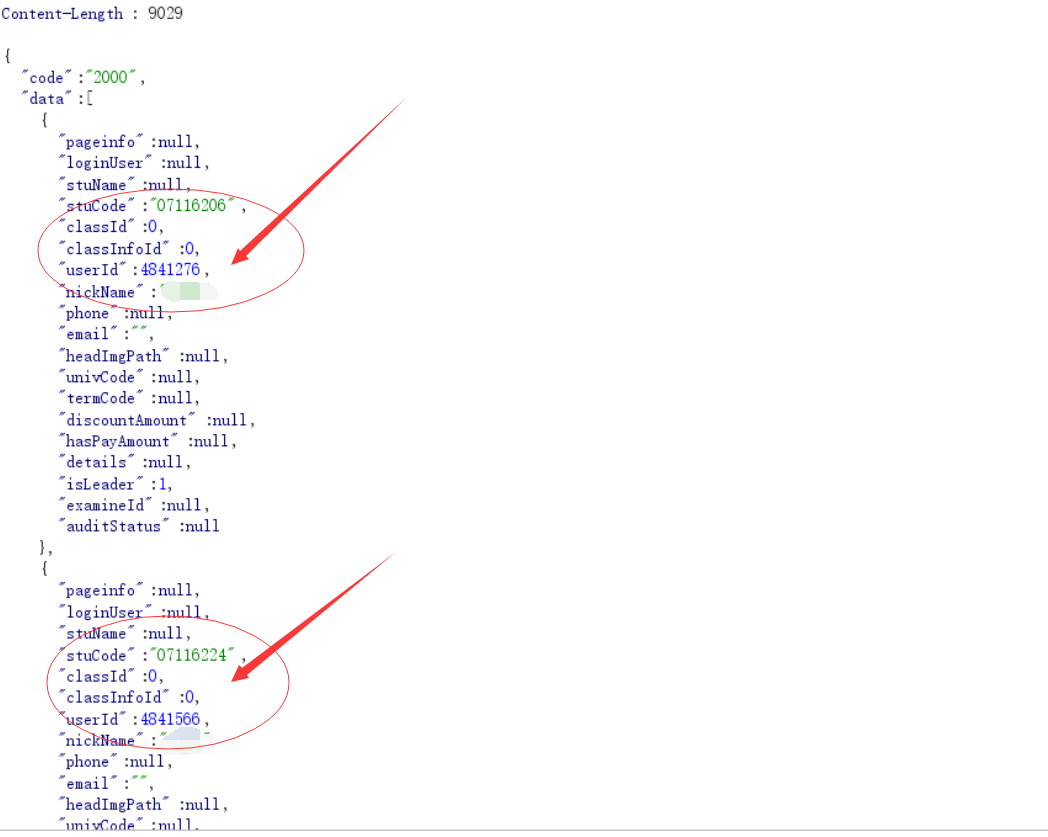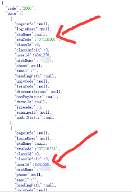 可以看到其他同班同学的个人资料,有学号、电话、邮箱,并且因为默认密码为123456,所以获取其他人的学号后可以登录很多的账号;重要的是,该接口泄露了userid!这在接下来的漏洞二中有着很严重的危害: