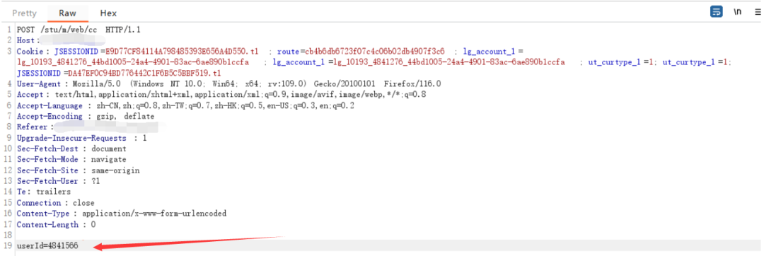 比如我们想登录这位07116224的同学账号,未授权访问获取userId=4841566