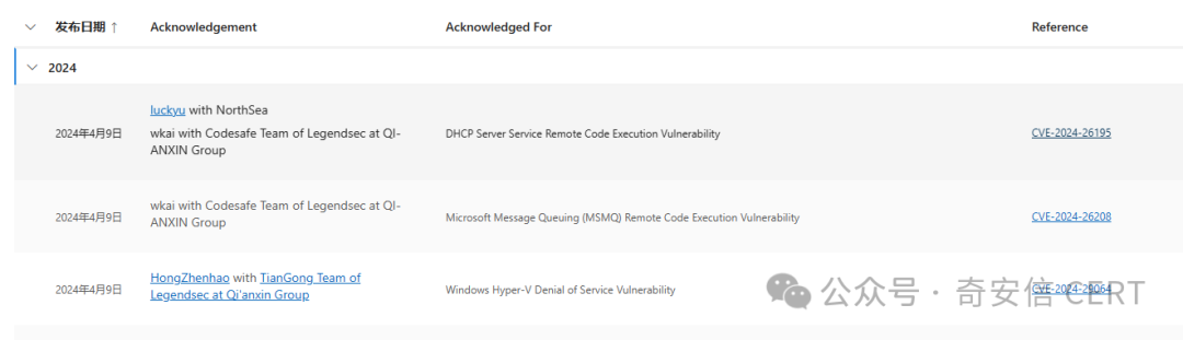 CVE-2024-26195 DHCP 服务器服务远程代码执行漏洞、CVE-2024-26208 Microsoft 消息队列 (MSMQ) 远程代码执行漏洞由奇安信代码安全实验室安全研究员发现并提交。