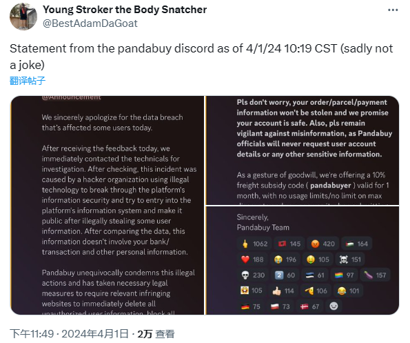 创立数据泄露汇总服务Have I Been Pwned、任职微软的安全研究员Troy Hunt证实了这些泄露的数据确实来自熊猫购物。Troy Hunt还透露,黑客声称的300万账户有所虚构夸大,根据Have I Been Pwned的数据,共有1348407个熊猫购物账户在此次泄露中受到影响。