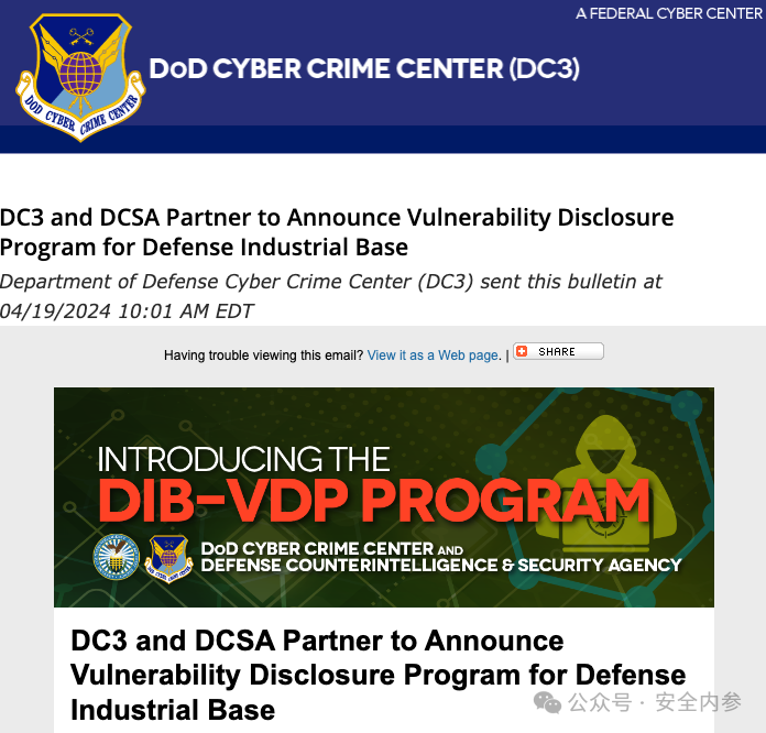美国国防部网络犯罪中心19日宣布,将与国防反情报与安全局合作建立全面的国防工业基地漏洞披露计划,简称DIB-VDP。DIB公司可以免费自愿参与该计划。