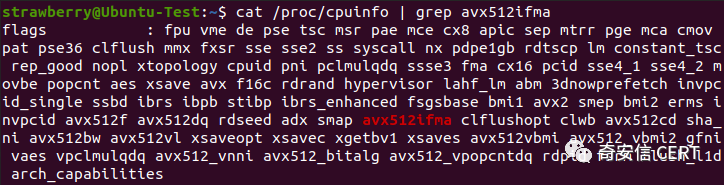 命令确认系统不支持 AVX512IFMA 扩展指令,如果输出中没有 “avx512ifma” 则代表系统不支持AVX512IFMA 扩展指令,下图是支持的例子: