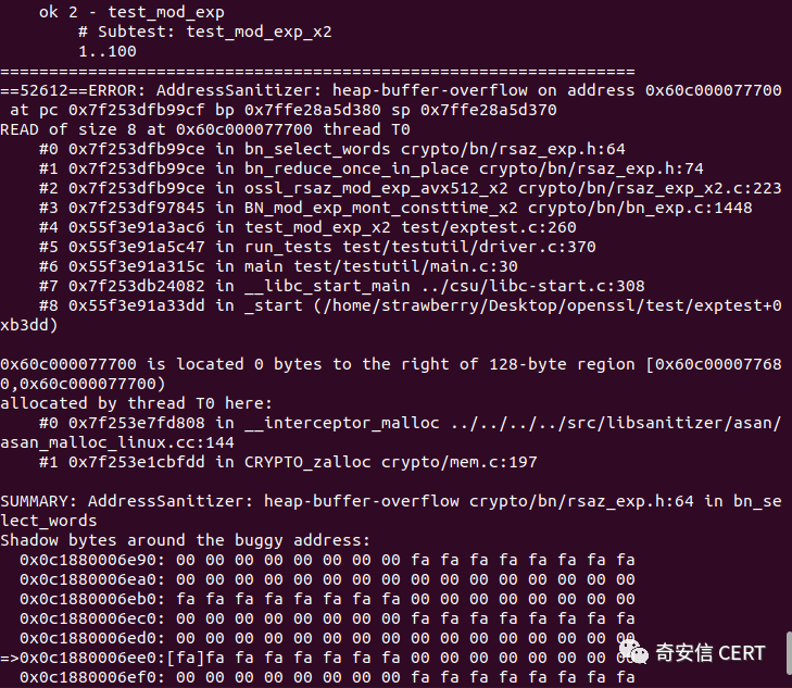 目前,奇安信CERT已成功复现OpenSSL RSA远程代码执行漏洞(CVE-2022-2274),截图如下: