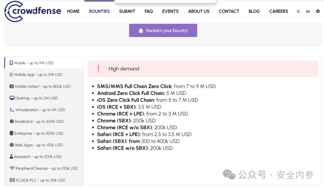 Crowdfense为iPhone零日漏洞提供500万至700万美元的报价,为入侵安卓手机的零日漏洞提供高达500万美元的报价,为Chrome和Safari的零日漏洞分别提供300万美元和350万美元的报价,并为WhatsApp和iMessage的零日漏洞提供300万至500万美元的报价。