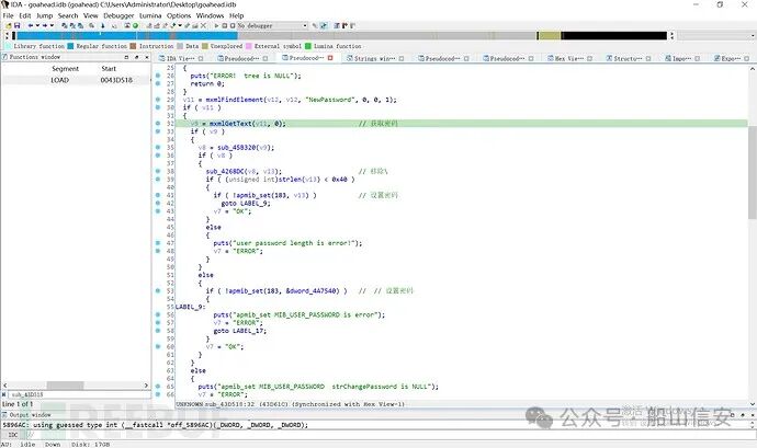 分析sub_43D518函数函数,发现其32行获取了修改的密码,随后在38行调用sub_45B320函数进行解密。当sub_45B320执行成功,且原始密码长度小于0x40,则会在41行设置密码。当sub_45B320执行失败时,则在53行设置一个密码。