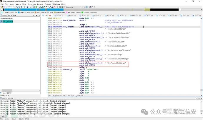 查看off_589200处数据,发现了SetPasswdSettings字段,其后面跟着一个函数地址。