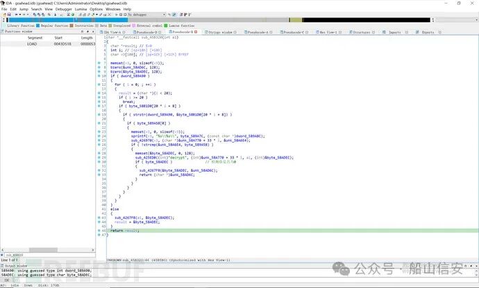 查看sub_45B320函数,其29行调用 sub_425ED0函数进行解密,并在30行检测byte_58ADEC是否为0,为0则继续循环。当循环20次后则通过16行代码跳出循环,返回结果0。