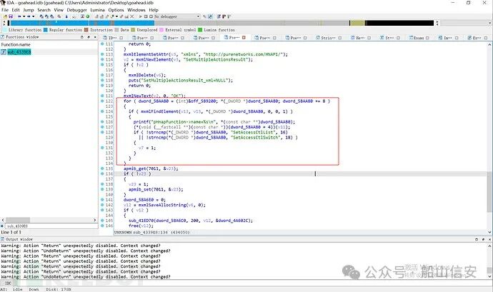 请求处理函数sub_4339E8使用for循环检测传入的XML数据,满足条件时调用dword_58AA80 + 4,其dword_58AA80初始值为地址off_589200。