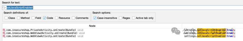 为了识别 webview 及其在代码库中的用法,我们需要开始查找具有 Android API  setJavaScriptEnabled(true) 的活动;宣布。