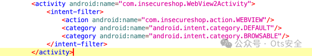 移动应用程序可能需要在 Web 视图中加载内容,例如通过 SDK 处理付款或在应用程序中购买积分时重定向到条款和条件页面。但是,验证 Web 视图中呈现的 URL 以防止潜在的安全风险非常重要。如果存在缺陷,攻击者可以通过在其他安全的 Web 视图中加载恶意网页来利用它。我们使用 apktool 获取 AndroidManifest.xml 文件并查看 InsecureShop 应用程序中的活动。正如我们从前面的示例中了解到如何识别深层链接。