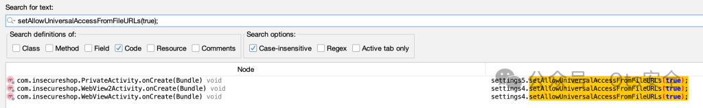 我们使用 Jadx 搜索来查找它所在的实例。这些是我们需要执行我们可以控制的 Javascript 的活动,它将在 insecureShop 应用程序的上下文中触发。