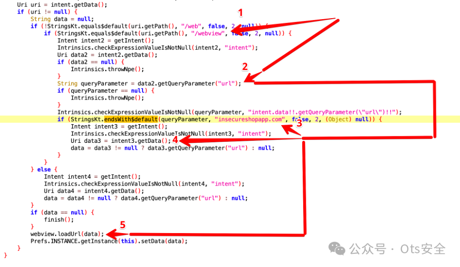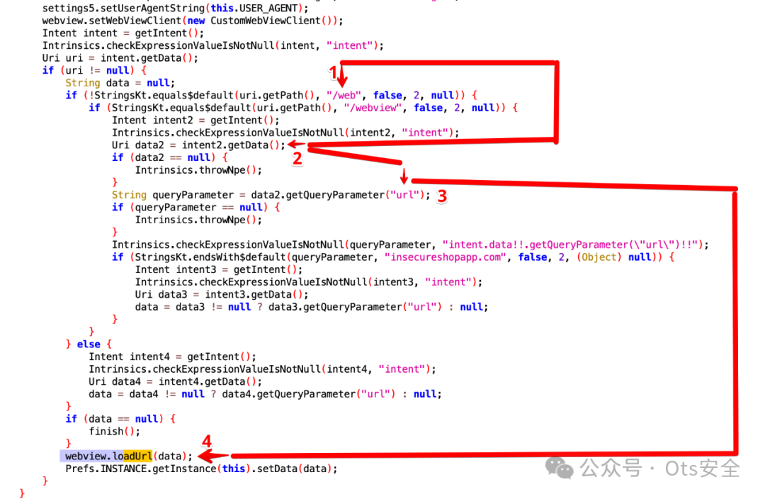 在这里我们可以看到,这个特定的 WebView 模式将端点作为“/web”,之后添加了名为“url”的深层链接模式的意图,并通过“webview.loadUrl(”进一步加载到 WebView 中)数据)”。