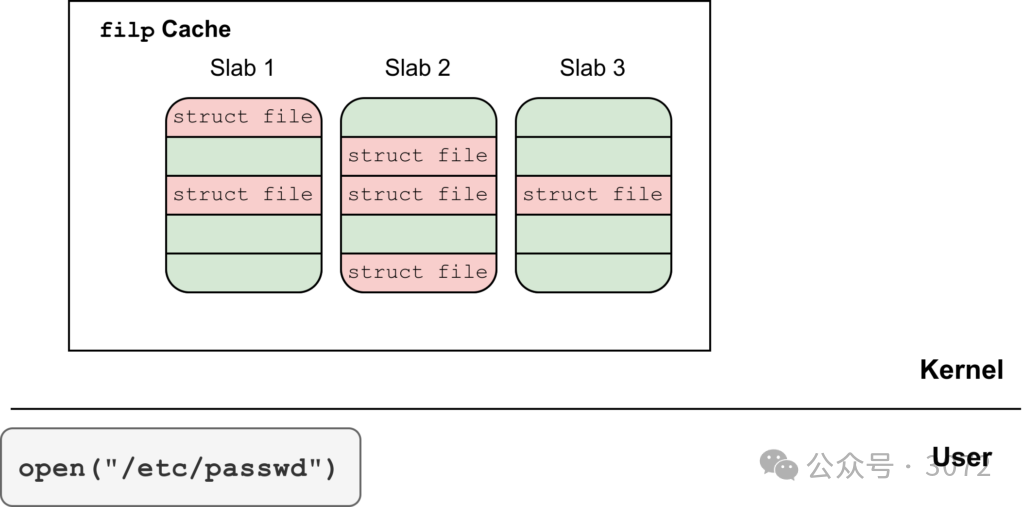 其中这样的缓存 Slab 是 filp,它包含 file 结构体。下一个列表显示了 file 结构体,它表示一个打开的文件。