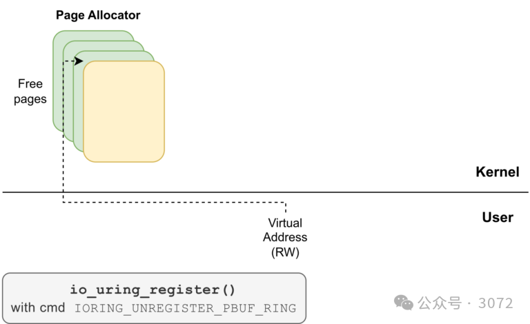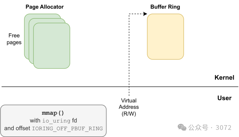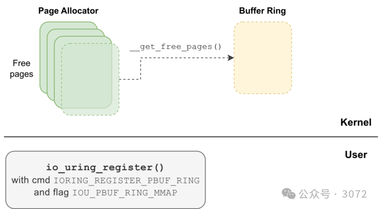 - 使用操作码 IORING_REGISTER_PBUF_RING 和 IOU_PBUF_RING_MMAP 标志执行 io_uring_register() 系统调用,以便内核自己为提供的缓冲环分配内存。