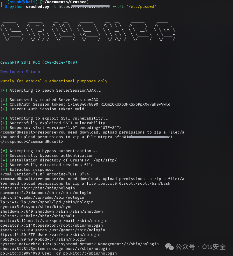 通过服务器端模板注入 (SSTI) 和身份验证绕过来利用 CrushFTP 服务器中的严重严重漏洞。将此漏洞提升为本地文件包含 (LFI)!此 PoC 漏洞利用的目的是自动检测托管 CrushFTP 的 sFTP 服务器中的漏洞以及漏洞利用!