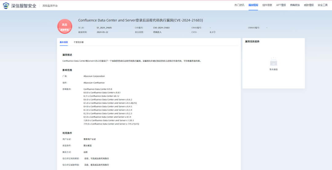 2024年5月22日,深瞳漏洞实验室监测到一则Atlassian-Confluence组件存在代码注入漏洞的信息,漏洞编号:CVE-2024-21683,漏洞威胁等级:高危。