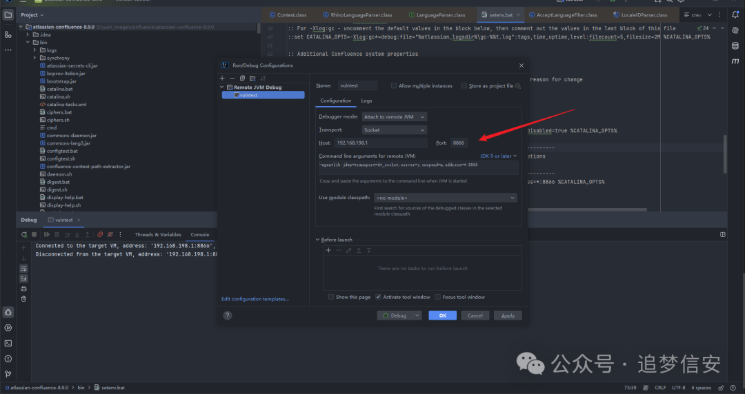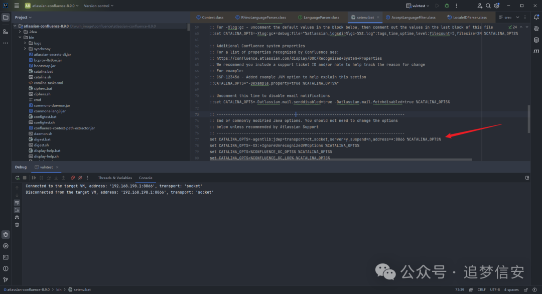 然后idea打开D:\vuln_image\confluence\atlassian-confluence-8.9.0,修改bin目录下的setenv.bat,添加这么一行: