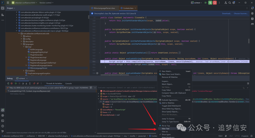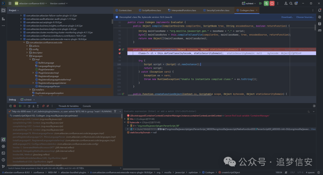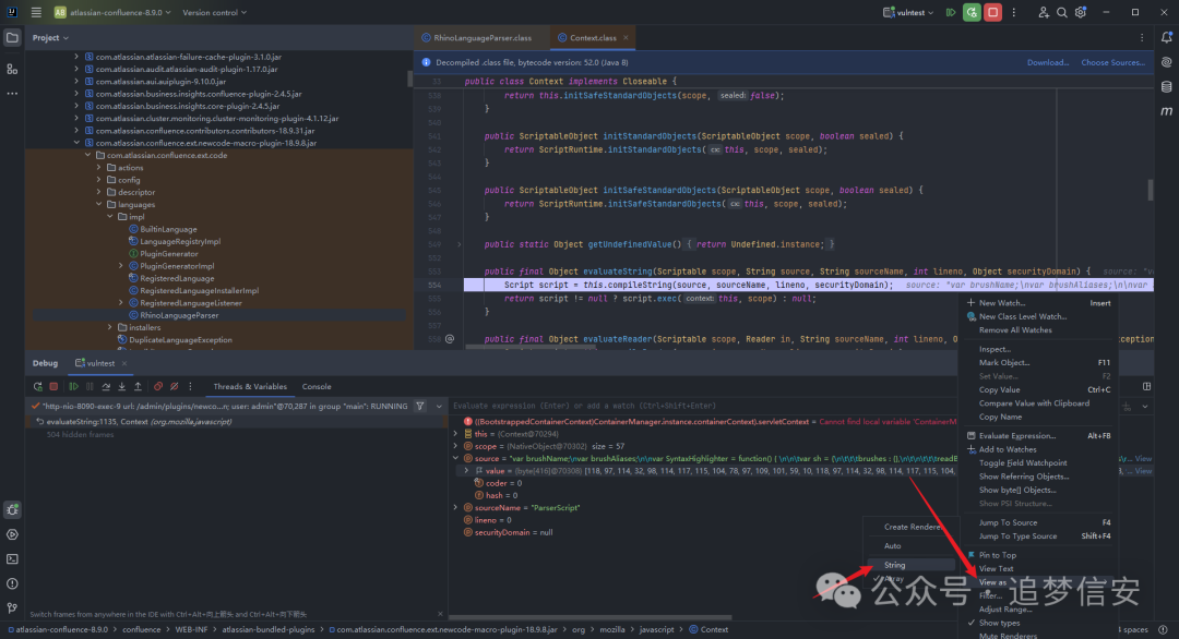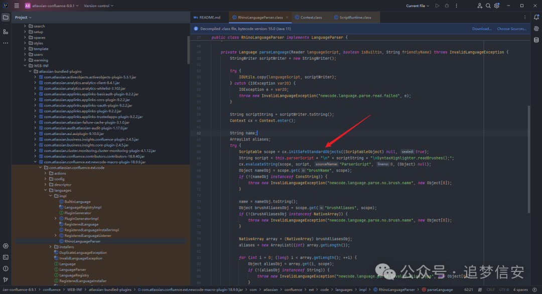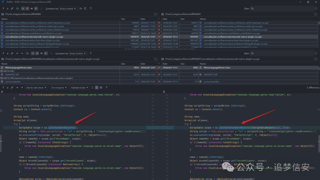 从上往下翻,发现D:\vuln_image\confluence\diff\atlassian-confluence-8.9.0\confluence\WEB-INF\atlassian-bundled-plugins\com.atlassian.confluence.ext.newcode-macro-plugin-18.9.8.jar进行了一处安全修复,因为名字实在是太显眼了,从initStandardObjects变成了initSafeStandardObjects,多加了个safe,极有可能就是本漏洞的问题所在: