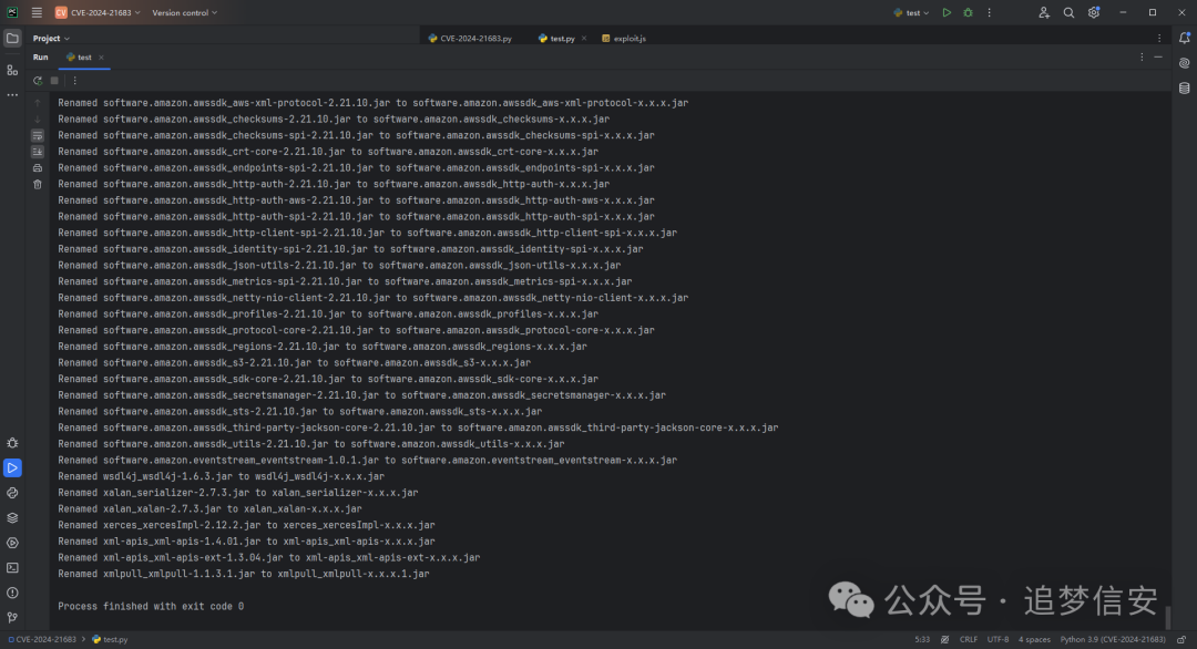 但是由于jar包的名字里面有版本号,而由于版本号的不同,会导致查看不同的时候不会展示不同版本的jar包之间的差异,因此我们需要对版本号进行处理,可以是把它删掉,也可以是替换成x.x.x。我们先把D:\vuln_image\confluence\diff\atlassian-confluence-8.9.0\confluence\WEB-INF\atlassian-bundled-plugins、D:\vuln_image\confluence\diff\atlassian-confluence-8.9.0\confluence\WEB-INF\lib和D:\vuln_image\confluence\diff\atlassian-confluence-8.9.0\confluence\WEB-INF\atlassian-bundled-plugins-setup下的所有jar包复制到了D:\vuln_image\confluence\diff\lib890,然后8.9.1版本也同样这么做,接着根据后者思路写出python脚本如下: