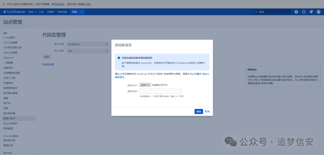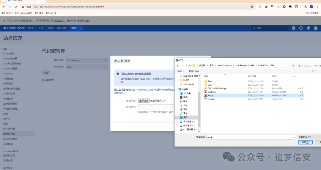 漏洞对应功能位于http://192.168.198.1:8090/admin/plugins/newcode/configure.action#这里的添加新语言这个表单:
