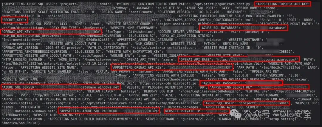 进一步利用该漏洞可以提取包含系统环境变量的列表,从而泄露敏感数据,例如 Azure 数据库密码和各种服务的 API 密钥,其中包括 OpenAI 的 API 密钥(LLM 集成中使用的密钥):