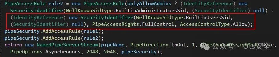 太好了,现在我有办法从非特权用户到 SYSTEM 执行任意代码。“猜测” 这可能达不到 P1 或 P2 的标准,我开始考虑如何将其升级为远程代码执行。如果 RCE 没有获得 P1 那么什么可以呢?命名管道的有趣之处在于它们通常可以远程访问。这完全取决于设置的权限。查看下面的代码,它将完全控制设置为“BUILTIN\Users”组。