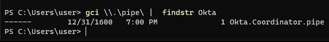 继续查看 dotPeek 中的 DLL,我找到了该服务使用的代码。我注意到的第一件事是它设置了一个 NamedPipe 服务器,该服务器侦听更新 Okta 验证软件的命令。这是 Windows 中的常见设计范例,用于使低特权应用程序能够与高特权服务进行通信以执行更新,因为这些通常需要提升的特权。这是一个复杂的机制,很难正确执行,而且通常是查找错误的好地方。我能够使用一点 Powershell 来确认命名管道服务器的存在。