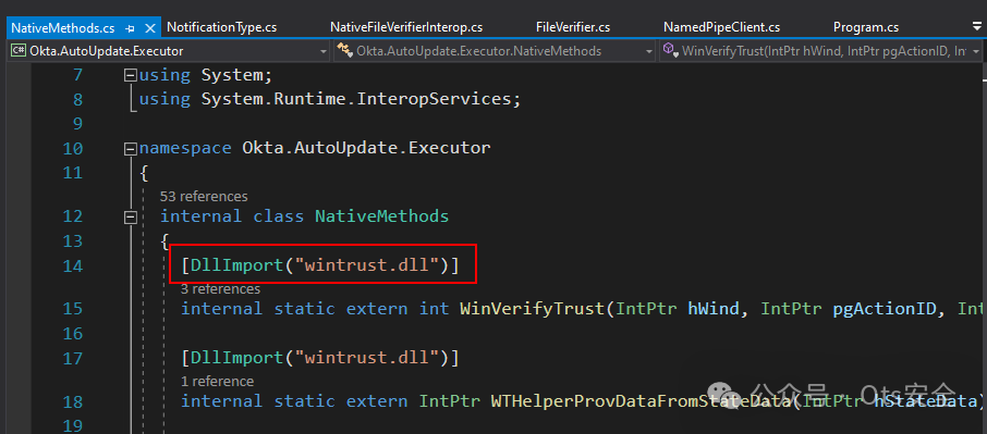 我最初的想法是提供一个合法的 Okta 验证包,因为这会通过签名检查。然后我可以使用 ProcMon 来识别安装包中的 DLL 劫持。特权 DLL 劫持几乎发生在所有服务中,因为假设您已经需要写入特权位置的权限。但讽刺的是,我发现服务二进制文件实际上在签名验证之前包含了 DLL 劫持,以加载必要的加密库。如果我将 DLL 写入C:\Program Files (x86)\Okta\UpdateService\wintrust.dll,它将在签名验证之前加载。