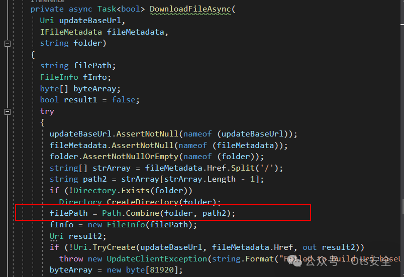 从这里我查看了负责处理从攻击者控制的更新服务器检索到的 JSON 消息的代码。应用程序期望收到一条消息,其中包含有关更新包的元数据,包括版本控制和文件元数据对象数组。这些对象包含几个相关字段,例如下载 URL、大小、哈希、类型和命令行参数。提供的下载 URL 使用与之前相同的域检查算法进行验证。如果检查通过,软件将下载该文件并将其写入磁盘。这就是事情变得有趣的地方。该代码从接收到的元数据中解析下载 URL,并通过调用Path.Combine函数构建文件路径。