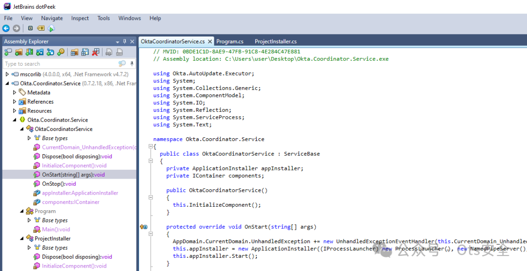 当我在 JetBrains dotPeek 中打开可执行文件时,我可以确认它确实是一个 .NET 应用程序。该二进制文件似乎是一个服务包装器。它处理与服务相关的功能:安装、卸载、启动、停止等。它引用 Okta.AutoUpdate.Executor 类,该类恰好在同一目录中具有匹配的 DLL。