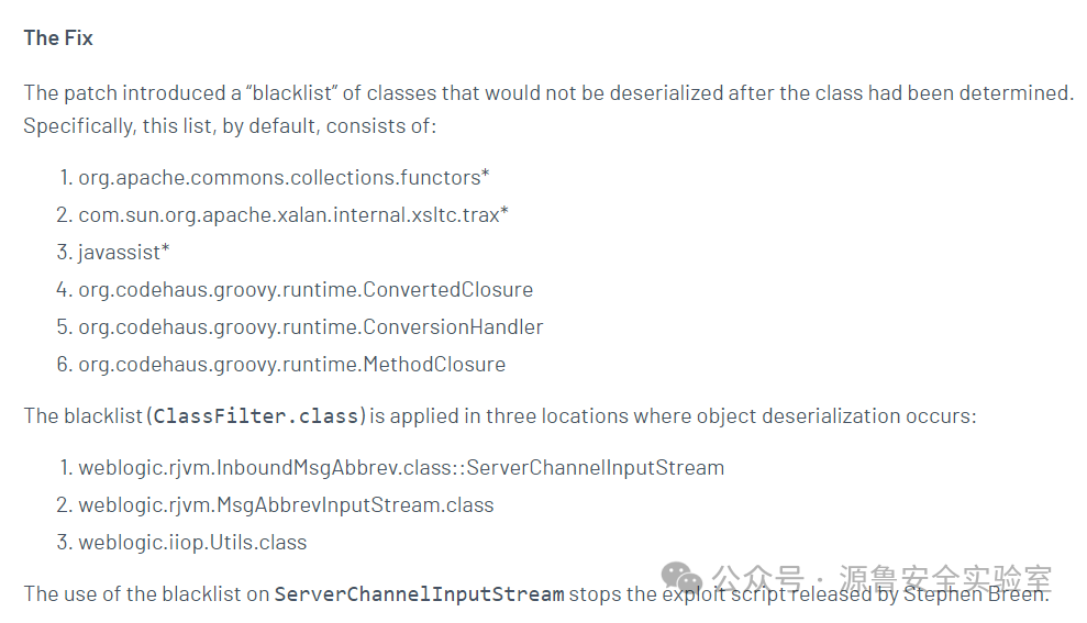 由于在weblogic中RMI使用的协议为weblogic自己实现的T3协议,因此在不影响自身业务的情况下,weblogic官方对于新漏洞的修复只能是不断添加黑名单。虽然这种修复方式对于新出的漏洞立竿见影,但是对于其绕过方式就没有任何效果了,这也是为什么weblogic的反序列化漏洞层出不穷的原因。