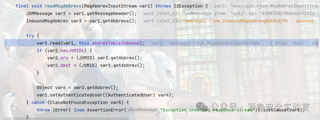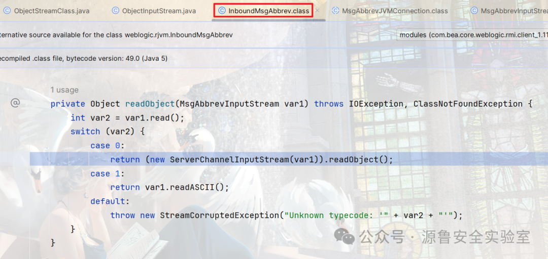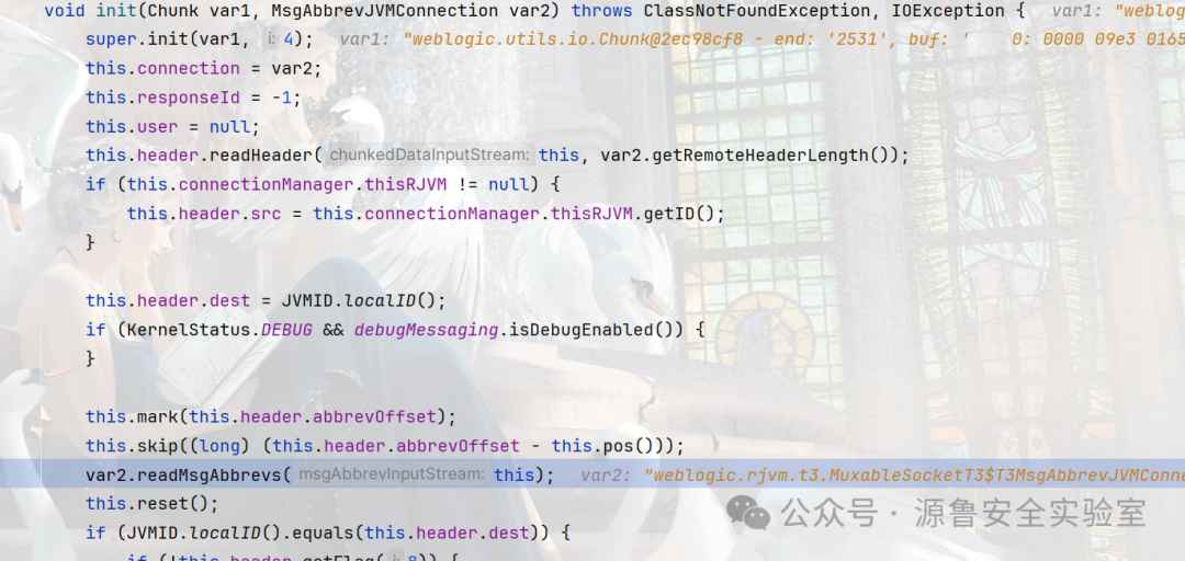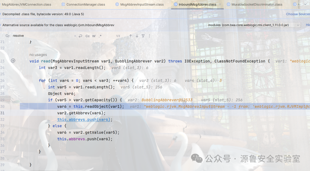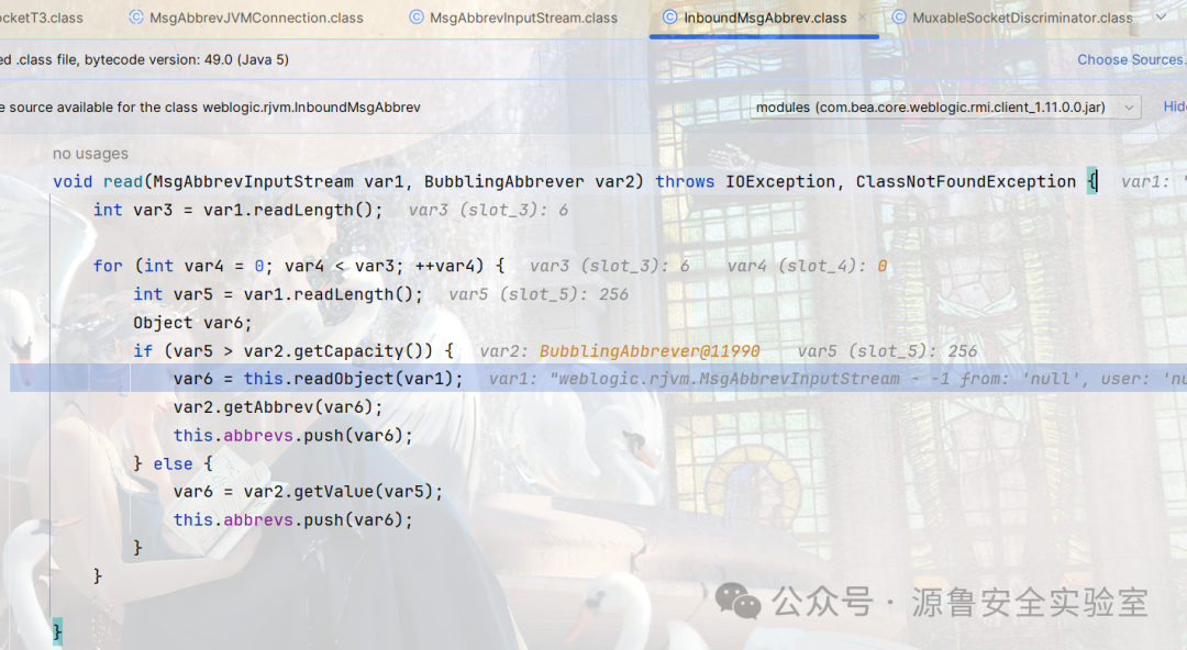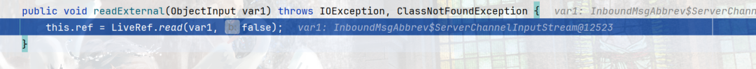 在 weblogic.rjvm.InboundMsgAbbrev.read中调用了this.readObject(),也就是