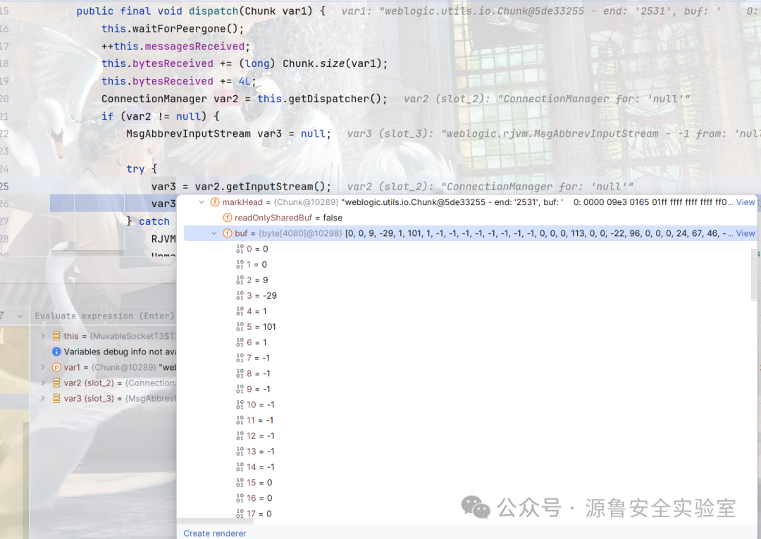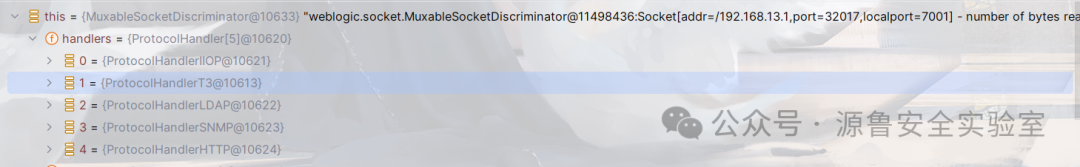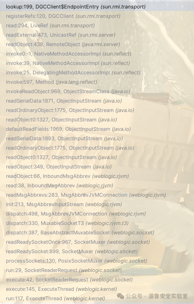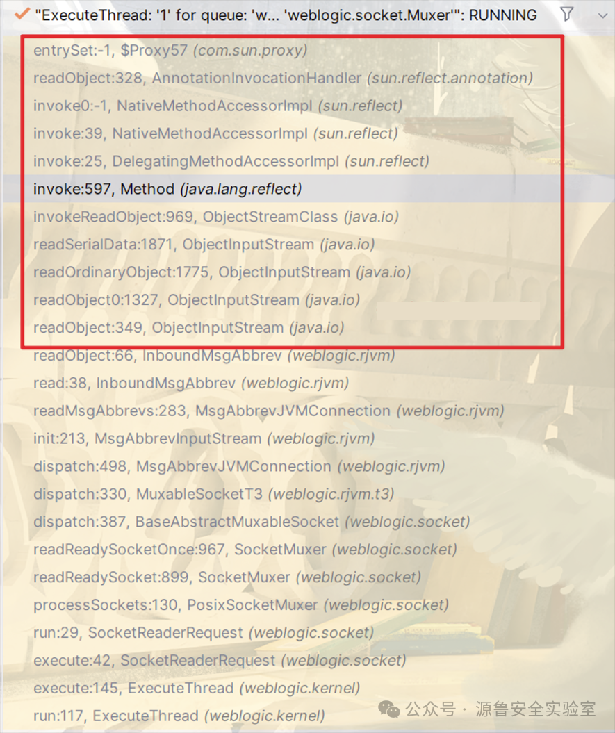 这里的漏洞触发点与上述一样,同样是T3协议造成的,堆栈图如下: