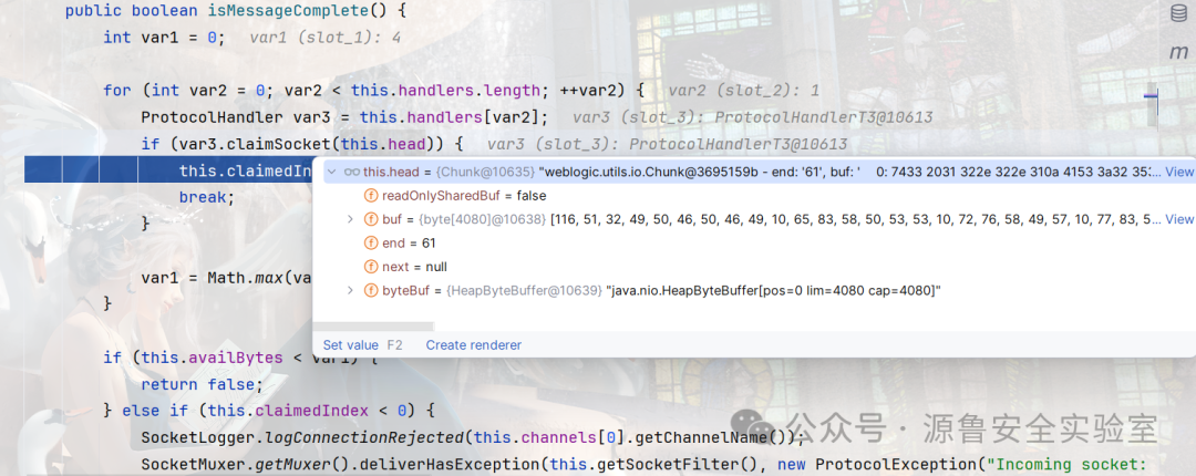 在isMessageComplete:83, MuxableSocketDiscriminator (weblogic.socket)中,会对当前的socket连接进行判断:
