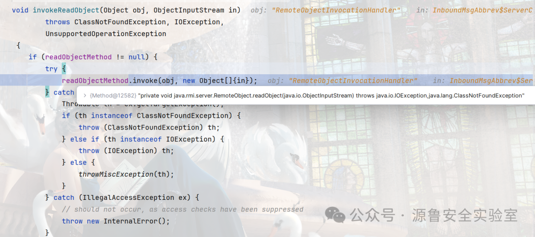 绕过黑名单限制之后,就是ObjectStreamClass的一些常规反序列化操作,一直执行到RemoteObjectInvocationHandler.readObject: