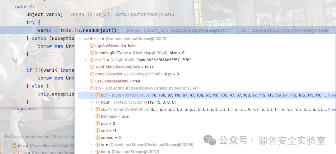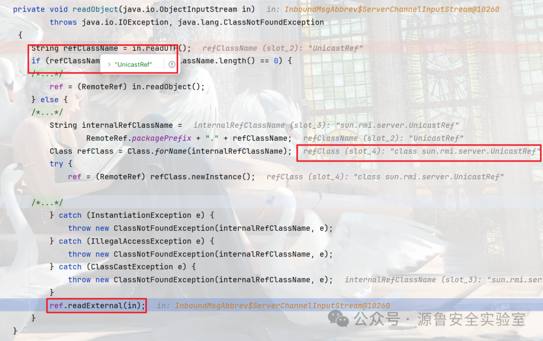 而RemoteObjectInvocationHandler没有实现readObject方法,因此实际上调用的是其父类RemoteObject的readObject方法,方法中,先检测refClassName是否为空,为空则直接反序列化输入的ObjectInputStream,不为空则动态加载sun.rmi.server+refClassName,这里实际上加载的是sun.rmi.server.UnicastRef。最后调用了ref.readExternal(in)方法: