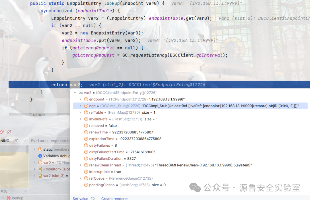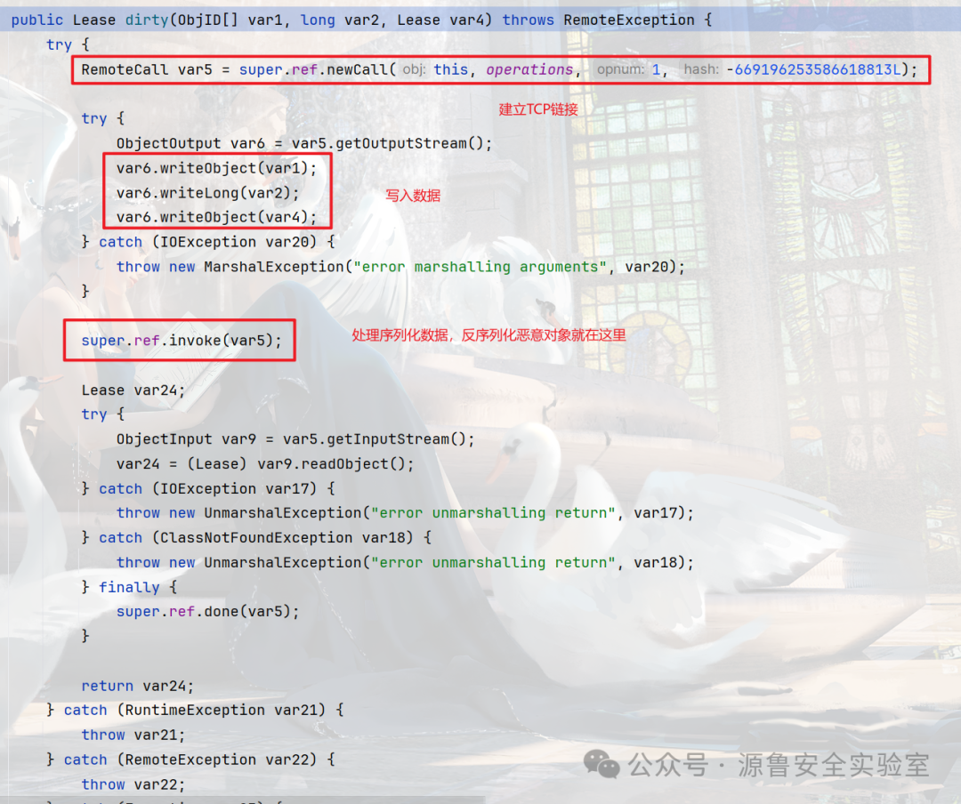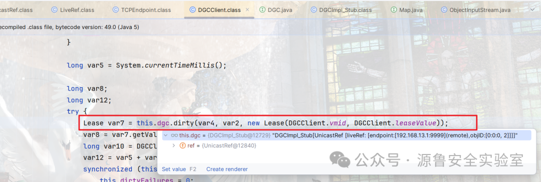 在函数makeDirtyCall中,通过 Lease var7 = this.dgc.dirty(var4, var2, new Lease(DGCClient.vmid, DGCClient.leaseValue)); 来执行JRPM请求: