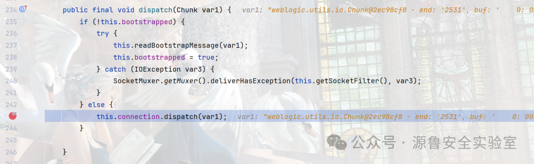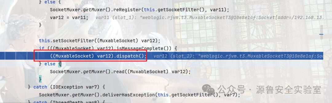 在dispatch:330, MuxableSocketT3 (weblogic.rjvm.t3) , 就已经识别出了这是一个t3协议的请求,往下都是socket建立连接的过程。