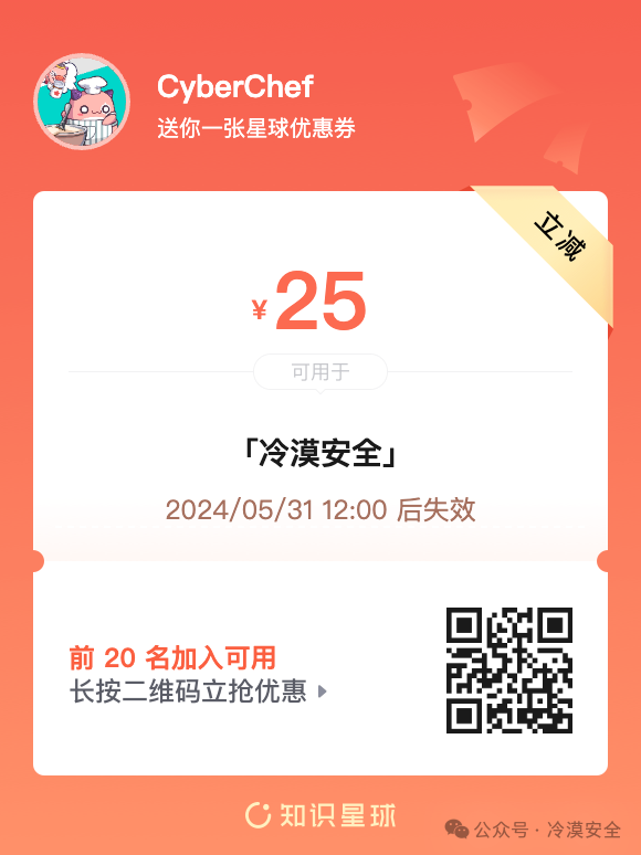 知识星球:冷漠安全交个朋友,限时优惠券:加入立减25星球福利:每天更新最新漏洞POC、资料文献、内部工具等