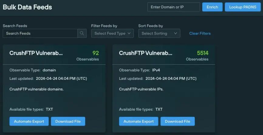 企业用户可以下载原始数据,并以 API 端点的形式导出批量数据源,其中列出易受攻击的 CrushFTP 域和 IP。