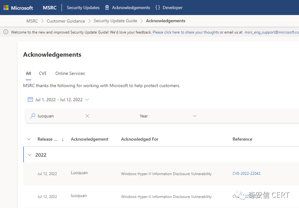 以下两个漏洞由奇安信代码安全实验室研究员发现并提交,包括:CVE-2022-22042 Windows Hyper-V信息泄露漏洞和CVE-2022-30223 Windows Hyper-V信息泄露漏洞。鉴于这些漏洞危害较大,建议客户尽快安装更新补丁。