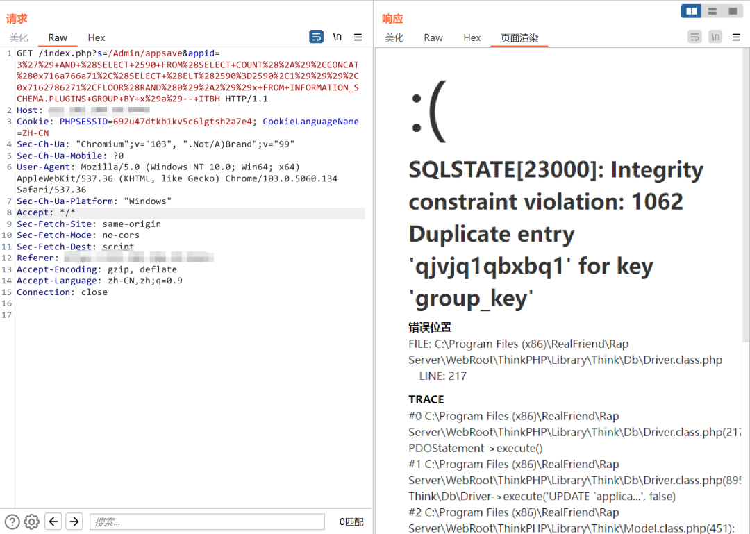 瑞友天翼应用虚拟化系统中的\Home\Controller\AdminController存在appsave/appdel两个无需鉴权并且存在SQL注入的风险的接口。攻击者可利用php PDO默认支持堆叠的方式使用堆叠写入恶意文件导致RCE。